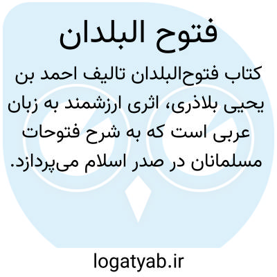 [ویکی فقه] فتوح البلدان (ترجمه). «فتوح البلدان»، ترجمه ای فارسی به قلم دکتر محمد توکل، از کتاب احمد بن یحیی بلاذری است.