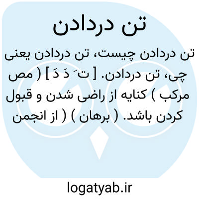 تن دردادن. [ ت َ دَ دَ ] ( مص مرکب ) کنایه از راضی شدن و قبول کردن باشد. ( برهان ) ( از انجمن آرا ) ( از آنندراج ) ( از فرهنگ رشیدی ) ( از غیاث اللغات ). راضی شدن. ( از شرفنامه منیری ). حاضر شدن برای امری و قبول کردن کاری. ( از فرهنگ فارسی معین ). تن اندردادن: