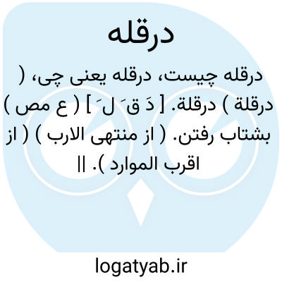 ( درقلة ) درقلة. [ دَ ق َ ل َ ] ( ع مص ) بشتاب رفتن. ( از منتهی الارب ) ( از اقرب الموارد ). || پایکوبی نمودن. ( از منتهی الارب ). رقص. ( اقرب الموارد ). || گشاده گام رفتن. گشاده گام رفتن به ناز و خرامیدن. ( از منتهی الارب ). تبختر. ( اقرب الموارد ). || رام و فرمانبردار گردیدن کسی را. ( از منتهی الارب ) ( از اقرب الموارد ).