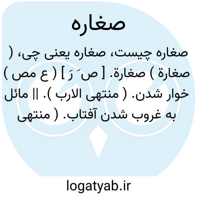 ( صغارة ) صغارة. [ ص َ رَ ] ( ع مص ) خوار شدن. ( منتهی الارب ). || مائل به غروب شدن آفتاب. ( منتهی الارب ) ( اقرب الموارد ). || خرد گردیدن. ( منتهی الارب ). || ( اِمص ) خردی. ( منتهی الارب ). || خردی قدر و منزلت. ( منتهی الارب ).