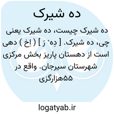 ده شیرک. [ دِه ْ رَ ] ( اِخ ) دهی است از دهستان پاریز بخش مرکزی شهرستان سیرجان. واقع در 55هزارگزی شمال سعید آباد. سکنه آن 150 تن. آب آن از رودخانه تأمین می شود. ( از فرهنگ جغرافیایی ایران ج 8 ).