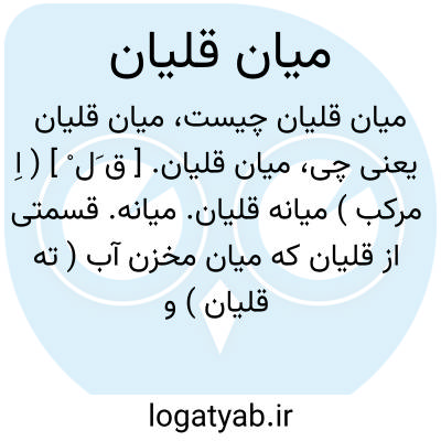 میان قلیان. [ ق َل ْ ] ( اِ مرکب ) میانه قلیان. میانه. قسمتی از قلیان که میان مخزن آب ( ته قلیان ) و جایگاه تنباکو و آتش در قلیان قرار دارد و آن چوبی است میان تهی که بر آن به عمل خراطی برجستگیها و فرورفتگیهای مدور باشد تزیین را و در انتها، نی مانندی میان تهی دارد که داخل آب گردد و آن را نی آب گویند و خود میانه را بر کوزه قلیان یا ته قلیان جای دهند و سرقلیان را بالای آن قرار دهند. و در بدنه آن سوراخی است که به تجویف میانه غلیان رسد و یک سر چوبی نی مانندیا نی پیچی را بدان متصل سازند و سر دیگر آن را در دهان گیرند و نفس فرو برند تا دود حاصل از اشتعال تنباکو از میانه قلیان بگذرد و داخل دهان وریه شود.