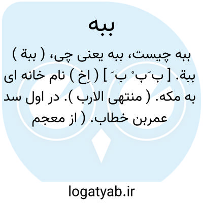 ( ببة ) ببة. [ ب َب ْ ب َ ] ( اِخ ) نام خانه ای به مکه. ( منتهی الارب ). در اول سد عمربن خطاب. ( از معجم البلدان ). دار ببه به مکه است. ( ناظم الاطباء ) ( آنندراج ).