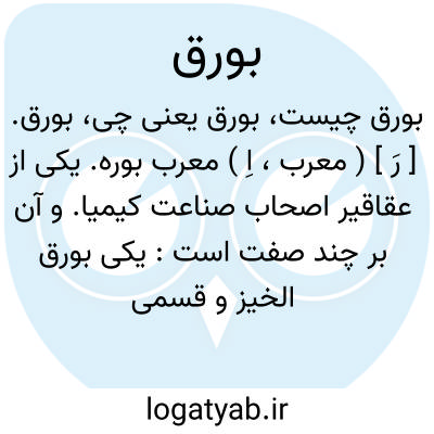 بورق. [ رَ ] ( معرب، اِ ) معرب بوره. یکی از عقاقیر اصحاب صناعت کیمیا. و آن بر چند صفت است: یکی بورق الخیز و قسمی دیگر که آنرا نطرون گویند و بورق الصناعة و زراوندی و این بهترین صنف بورق است. ( مفاتیح ). چیزی است مانند نمک. معرب بوره. ( غیاث ). انواع آن: بوره ارمنی، بوره زرگری، بوره خبازان و بوره زراوندی که بسرخی زند. بوره کرمانی، بوره مغربی و الوانش بسیاراست. ( از نزهة القلوب ). رجوع به بوره و بورک شود.