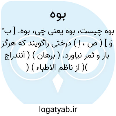 بوه. [ ب ُ وَ ] ( ص، اِ ) درختی راگویند که هرگز بار و ثمر نیاورد. ( برهان ) ( آنندراج )( از ناظم الاطباء ) ( از اشتینگاس ). || مردم آهسته. ( برهان ) ( آنندراج ). مردم باوقار و باتمکین وباشرم. ( ناظم الاطباء ). رجوع به بوند و بونده شود.