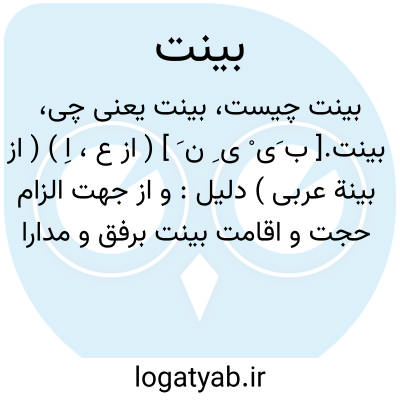بینت.[ ب َی ْ ی ِ ن َ ] ( از ع، اِ ) ( از بینة عربی ) دلیل: و از جهت الزام حجت و اقامت بینت برفق و مدارا دعوت فرمود. ( کلیله و دمنه ). مرد... توبه کرد پیش از وضوح بینتی. ( کلیله و دمنه ). الا بکوشم تا بینتی صادق بدست آید. ( کلیله و دمنه ). رجوع به بینة شود.