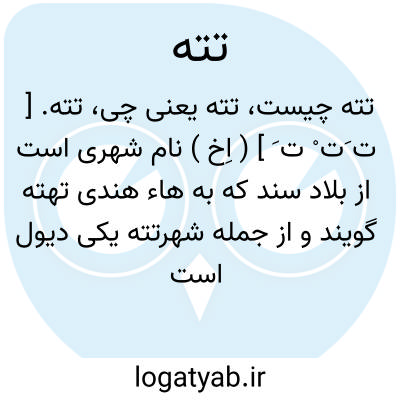 تته. [ ت َت ْ ت َ ] ( اِخ ) نام شهری است از بلاد سند که به هاء هندی تهته گویند و از جمله شهرتته یکی دیول است که حکیم دیولی شاعر از آنجا بوده و دیبل معرب دیول است باری منسوب به آن شهر را تتوی گویند و از آنجا بوده رشیدالدین صاحب کتاب منتخب اللغه و فرهنگ رشیدی. امیرخسرو دهلوی گفته: