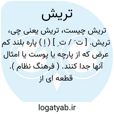 تریش. [ ت َ / ت ِ ] ( اِ ) پاره بلند کم عرض که از پارچه یا پوست یا امثال آنها جدا کنند. ( فرهنگ نظام ). قطعه ای از پارچه و یا پوست و جز آن که بلند و باریک باشد. ( ناظم الاطباء ). تریشه. ( ناظم الاطباء ) ( فرهنگ نظام ). و رجوع به تریشه شود.