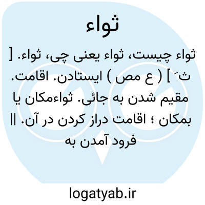 ثواء. [ ث َ ] ( ع مص ) ایستادن. اقامت. مقیم شدن به جائی. ثواءمکان یا بمکان؛ اقامت دراز کردن در آن. || فرود آمدن به مکانی. || مدفون گردیدن.