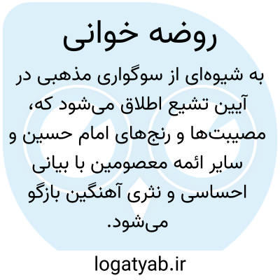 [ویکی شیعه] روضه خوانی (آیین). رَوضه خوانی شیوه ای از سوگواری که به ذکر مصیبت های امام حسین(ع) و سایر معصومان می پردازد. به مجالس عزاداری، مجلس روضه خوانی نیز گفته می شود. در این مراسم، روضه خوان بر منبر یا صندلی می نشیند و مصیبت یکی از بزرگان دین را با صدایی بلند و حزین برای اهل مجلس می خواند. پیشینه ورود واژه های روضه و روضه خوانی به ادبیات عزاداری شیعیان، به قرن دهم و انتشار کتاب روضة الشهداء برمی گردد.