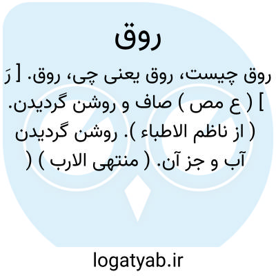 روق. [ رَ ] ( ع ص، اِ ) شاخ. ج، اَرواق. ( منتهی الارب ) ( ناظم الاطباء ) ( آنندراج ). شاخ ستور. ( دهار ). سرون. ( ناظم الاطباء ) ( از اقرب الموارد ). || پاره ای از شب. || طرف پایین خانه. ( ناظم الاطباء ) ( منتهی الارب ) ( آنندراج ) ( از اقرب الموارد ). || آغاز جوانی. ( از ناظم الاطباء ) ( آنندراج ) ( منتهی الارب ) ( از دهار ). آغاز و رونق جوانی. ( از اقرب الموارد ). || اول هر چیزی. ( از ناظم الاطباء ) ( منتهی الارب ) ( آنندراج ). اول هر چیزی در حسن. ( مهذب الاسماء ). || عمر و زندگانی. و از آن است: فلان اکل روقه؛ یعنی کلانسال گردید تا همه دندانهای وی بریخت. ( از اقرب الموارد ) ( منتهی الارب ) ( آنندراج ) ( ناظم الاطباء ). || اسب نیکوخلقت. ( ناظم الاطباء ) ( از منتهی الارب ) ( آنندراج ). اسب نیک آفرینش که بیننده را بشگفت آورد. ( از اقرب الموارد ). || پرده. ( ناظم الاطباء ) ( منتهی الارب ) ( آنندراج ) ( از اقرب الموارد ). || پرده ای که در زیر آسمان خانه کشند. ( ناظم الاطباء ) ( منتهی الارب ) ( آنندراج ). || جای صیاد. ( ناظم الاطباء ) ( منتهی الارب ) ( آنندراج ) ( از اقرب الموارد ). || کاشانه و پیشخانه. ( ناظم الاطباء ) ( منتهی الارب ) ( آنندراج ). رَواق. ( اقرب الموارد ). || دلاوری که کسی با او نتواند درافتد. ( ناظم الاطباء ) ( منتهی الارب ) ( آنندراج ) ( از اقرب الموارد ). || خرگاه: حین ضرب الشیطان روقه و مد اطنابه ( حدیث ). ( ناظم الاطباء ) ( آنندراج ) ( منتهی الارب ). خرگاه. ( آنندراج ). خیمه. ( دهار ). || جثه و بدن. ( از منتهی الارب ) ( ناظم الاطباء ) ( آنندراج ). جثه. ( اقرب الموارد ). || باران. ( المنجد ). || دوستی بی آمیغ. ( ناظم الاطباء ) ( منتهی الارب ) ( آنندراج ). دوستی خالص. ( از اقرب الموارد ). || بدل چیزی. || شگفت از چیزی. ( ناظم الاطباء ) ( منتهی الارب ) ( آنندراج ). || جماعت. ( ناظم الاطباء ) ( منتهی الارب ) ( آنندراج ) ( ازاقرب الموارد ). || نزع و کشش. ( منتهی الارب ) ( ناظم الاطباء ). || عزم مرد و کار و همت او. ( ناظم الاطباء ) ( منتهی الارب ) ( آنندراج ) ( از اقرب الموارد ). || مهتر. ( منتهی الارب ) ( آنندراج ). سید. ( اقرب الموارد ). || صاف و بی آمیغاز آب و جز آن. ( ناظم الاطباء ) ( از منتهی الارب ) ( از آنندراج ) ( از اقرب الموارد ). پالوده. ( شرفنامه منیری ). || خوش آیند از هر چیز. ( ناظم الاطباء ) ( منتهی الارب ) ( از اقرب الموارد ). || روق الفرس؛ نیزه ای که سوار آنرا میان دو گوش اسب دراز کرده باشد. ( ناظم الاطباء ) ( منتهی الارب ) ( از آنندراج ).