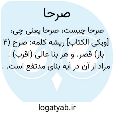 قصر. و هر بنا عالی (اقرب). مراد از آن در آیه بنای مدتفع است.. به او گفته شد وارد قصر شو چون آن را دید گمان بر آبی عمیق است. اصل صرح به معنی وضوح است «صَرَحَ الْاَمْرَ صَرَحاً: بَیَّنَهُ وَ اَظْهَرَهُ» ظاهراً قصر و عمارت مرتفع را از جهت مرئی و آشکار بودنش صرح گفته‏اند. این کلمه ژهار بار در قرآن مجید آمده است: نمل:44- قصص:38- غافر:36.