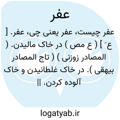 عفر. [ ع َ ف َ ] ( ع اِ ) خاک، و روی خاک. ( منتهی الارب ). رویه و سطح زمین: ماعلی عفرالارض مثله و خاک را نیز گویند. ( از اقرب الموارد ). ج، أعفار. || اول آب که کشت را دهند. ( منتهی الارب ) ( از اقرب الموارد ). || تیرها که مخاطالشیطان نامند آنرا. ( منتهی الارب ). «سهام » و تار عنکبوت که آن رامخاطالشیطان نامند. ( از اقرب الموارد ). || سختگی و اشکال: کلام لاعفر فیه؛ سخنی که عویص و اشکال در آن نباشد. ( از منتهی الارب ). عَفر. ( اقرب الموارد ). و رجوع به عَفر شود.