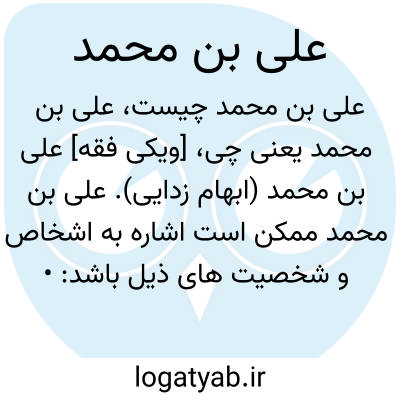 [ویکی فقه] علی بن محمد (ابهام زدایی). علی بن محمد ممکن است اشاره به اشخاص و شخصیت های ذیل باشد: • امام هادی علیه السلام، پیشوای دهم شیعیان، فرزند امام جواد (علیه السلام) و پدر بزرگوار امام حسن عسکری (علیه السلام)• علی بن محمد سمری، یکی از نواب خاص امام زمان (علیه السلام) در دوران غیبت صغری• امامزاده علی بن محمد، امامزاده عالی مقدار حضرت سلطانعلی بن امام محمد باقر (علیه السّلام)• علی بن محمد بدیهی، بَدیهی، ابوالحسن علی بن محمد (د ح ۳۸۰ق /۹۹۰م )، شاعر ایرانی عربی سرا• علی بن محمد نسفی بزدوی، مشهور به ابوالعسر، از فقهای بزرگ حنفی ماوراءالنهر در قرن پنجم• علی بن محمد لحیانی بستی، از مشایخ صوفیه خراسان در قرن پنجم• علی بن محمد بستی، ابوالفتح، علی بن محمّد از شاعران و منشیان معروف قرن چهارم• علی بن محمد بغدادی، علاءالدین ابوالحسن علی بن محمد بغدادی مشهور به «خازن» از مفسران اهل سنت و صاحب تفسیر خازن• علی بن محمد بیاضی بقاعی، ملقّب به زین الدّین و مکنّی به ابومحمد، متکلّم، مفسّر، منطقی، ادیب و شاعر امامی قرن نهم• علی بن محمد شیحی خازن، مفسر، فقیه، محدّث و صوفی قرن هفتم و هشتم• علی بن محمد بهاءالدین سمرقندی، مشهور به اِسبیجابی، فقیه حنفی و شیخ الاسلام سمرقند• علی بن محمد بن علی خزاز، کنیه اش ابوالقاسم، متکلم و محدّث و فقیه شیعی قرن چهارم• علی بن محمد بن هلال جزائری، زاهد و متقی و جامع المعقول و المنقول و استاد روایت ابن فهد حلی• علی بن محمد تونسی الایادی، شاعر دربار فاطمی در قرن چهارم• علی بن محمد تهامی، مکنّا به ابوالحسن، شاعر عرب در قرن پنجم• علی بن محمد خزرجی حصار، فقیه و محدّث مالکی قرن ششم و هفتم• علی بن محمد قاشی حلی، ملقب به نصیرالدین، متکلم و فقیه و محدّث امامی قرن هشتم• علی بن محمد علوی کوفی حمانی، از شاعران بزرگ شیعه و مهتر و نقیب (سرپرست) بنی هاشم در سده سوم• علی بن محمد شیحی خازن، مفسر، فقیه، محدّث و صوفی قرن هفتم و هشتم• علی بن محمد خزاز قمی، از چهره های برجسته فقها و راویان شیعه در نیمه دوم قرن چهارم هجری• علی بن محمد عاملی، نوه دختری محقق کرکی و نواده پسری شهید ثانی• سیدعلی بن محمدعلی حسینی میبدی، علامه میبدی فقیه، اصولی، شاعر، لغت دان و از مفاخر علمای قرن سیزده و چهاردهم هجری