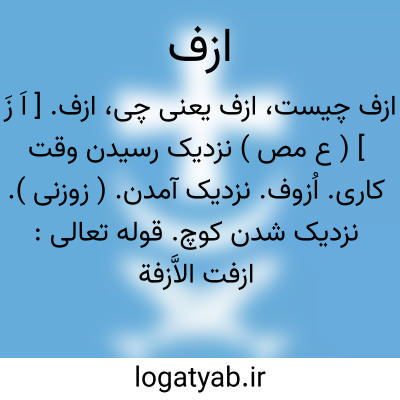 ازف. [ اَ زَ ] ( ع مص ) نزدیک رسیدن وقت کاری. اُزوف. نزدیک آمدن. ( زوزنی ). نزدیک شدن کوچ. قوله تعالی: ازفت الاَّزفة ( قرآن 57/53 )؛ نزدیک رسید قیامت. || شتافتن. شتاب کردن. ازوف: اَزف الرجل؛ بشتافت مرد. || مندمل شدن جراحت: ازف الجرح ُ. || ( اِمص ) تنگی و ناخوشی عیش. ( منتهی الارب ).