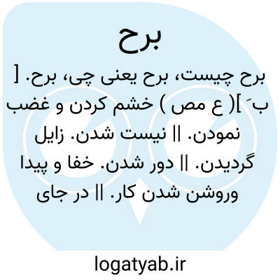 برح. [ ب َ ]( ع مص ) خشم کردن و غضب نمودن. || نیست شدن. زایل گردیدن. || دور شدن. خفا و پیدا وروشن شدن کار. || در جای خود به آنسو رفتن. || ( اِ ) سختی و گزند و بدی. ( منتهی الارب ) ( ناظم الاطباء ) ( آنندراج ). سختی. ( مهذب الاسماء ).
