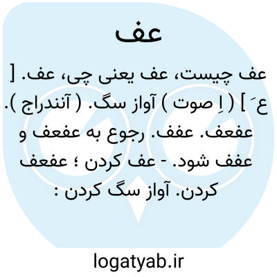 عف. [ ع َ ] ( اِ صوت ) آواز سگ. ( آنندراج ). عفعف. عفف. رجوع به عفعف و عفف شود.