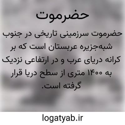 [ویکی شیعه] حَضْرَمَوْت نام قبیله و نام منطقه ای وسیع است که در شرق کشور یمن در جنوب جزیرة العرب و ساحل دریای عرب قراردارد. به مردم آن، حَضرَمی گفته می شود. ساکنین آن در زمان پیامبر اسلام (ص) مسلمان شدند. در طول تاریخ اسلام، شیعیان در آن زندگی می کردند.