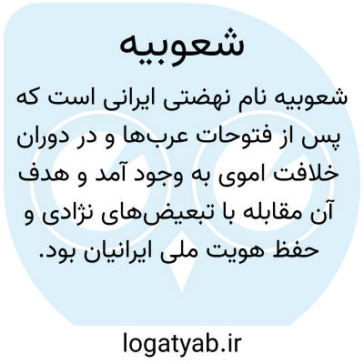 در لغت، «شعوبیه» یعنی اهل مساوات و برابری. و در اصطلاح «الشعوبیه فرقه لاتفضل العرب علی العجم» به این معنی است که شعوبیه گروهی اند که تامل به برتری عرب بر عجم نیستند. در برخی دیگر از کتب لغت، معنای خاص شعوبیه آورده شده است. برای نمونه "ابن حاجب" در تعریف شعوبیه می نویسد: «قوم متعصبون علی العرب مفضلون علیهم العجم» و "ابن منظور" می نویسد: «والشعوبی هو الذی یصغر شان العرب و لایری لهم فضلاً علی غیرهم؛ یعنی شعوبی کسی است که عرب را حقیر می داند و برای او برتری نسبت به دیگران قائل نیست.»