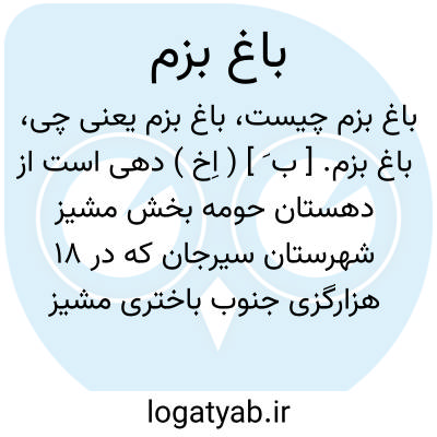 باغ بزم. [ ب َ ] ( اِخ ) دهی است از دهستان حومه بخش مشیز شهرستان سیرجان که در 18 هزارگزی جنوب باختری مشیز و 3 هزارگزی باختر راه مالروطویل چمن به مشیز واقع است. ناحیه ای است کوهستانی وسردسیر با 141 تن سکنه و آب آن از چشمه تأمین میشود. محصول عمده آن غلات و حبوب و شغل اهالی زراعت و راه آن مالرو است. ( از فرهنگ جغرافیایی ایران ج 8 ).