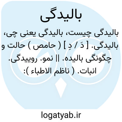 بالیدگی. [ دَ / دِ ] ( حامص ) حالت و چگونگی بالیده. || نمو. روییدگی. انبات. ( ناظم الاطباء ): غُرَّه؛ سرعت بالیدگی انگور. ( منتهی الارب ). || افزونی. || تکبر. ( ناظم الاطباء ).