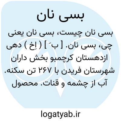 بسی نان. [ ب َ ] ( اِخ ) دهی ازدهستان کرچمبو بخش داران شهرستان فریدن با 267 تن سکنه. آب از چشمه و قنات. محصول آن غله و حبوب. شغل مردم آنجا زراعت و گله داری و صنایع دستی آنها جاجیم وقالی بافی است. ( از فرهنگ جغرافیایی ایران ج 10 ).