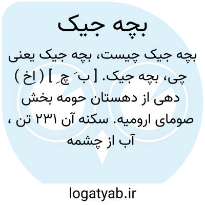 بچه جیک. [ ب َ چ ِ ] ( اِخ ) دهی از دهستان حومه بخش صومای ارومیه. سکنه آن 231 تن، آب از چشمه، محصول آن غلات و توتون. شغل اهالی زراعت و گله داری است. ( از فرهنگ جغرافیایی ایران ج 4 ).