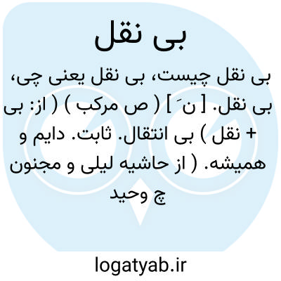 بی نقل. [ ن َ ] ( ص مرکب ) ( از: بی + نقل ) بی انتقال. ثابت. دایم و همیشه. ( از حاشیه لیلی و مجنون چ وحید ص 31 ). پابرجا: