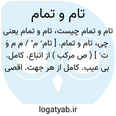 تام و تمام. [ تام ْ م ُ / م م وَ ت َ ] ( ص مرکب ) از اتباع. کامل. بی عیب. کامل از هر جهت. اقصی کمال ممکن. بدون نقص.
