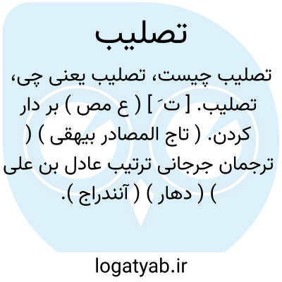تصلیب. [ ت َ ] ( ع مص ) بر دار کردن. ( تاج المصادر بیهقی ) ( ترجمان جرجانی ترتیب عادل بن علی ) ( دهار ) ( آنندراج ). بر دار کشیدن کسی را. ( منتهی الارب ) ( ناظم الاطباء ) ( از اقرب الموارد ). || صلیب ساختن مسیحی با دست بر خود. ( از اقرب الموارد ). چلیپا ساختن. ( منتهی الارب ) ( ناظم الاطباء ) ( آنندراج ). || صلیب گرفتن رهبان. ( از اقرب الموارد ). || به نگار چلیپا نگارین کردن جامه و جز آن را. ( منتهی الارب ) ( آنندراج ) ( ناظم الاطباء ). || سخت محکم گردیدن. سخت و محکم گردانیدن لازم و متعدی است. || خشک شدن خرمای تر. ( منتهی الارب ) ( آنندراج ) ( ناظم الاطباء ) ( از اقرب الموارد ). || چربش گرفتن از گوشت. ( منتهی الارب ) ( آنندراج ) ( ناظم الاطباء ). || ( اِ ) هیئت خمار که پوشش است مر زنان را. ( منتهی الارب ) ( ناظم الاطباء ) ( آنندراج ) ( از اقرب الموارد ). ج، تصالیب. فی الحدیث: لم یکن فیه تصالیب الا بفضة و هی جمع تصلیب و هو تصویر الصلیب و المراد الصور. ( منتهی الارب ) ( ناظم الاطباء ).