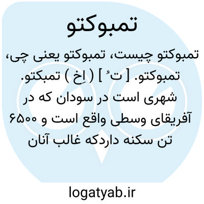 تمبوکتو. شهری است در سودان که در افریقای وسطی واقع است غالب آنان مسلمانند این شهر بر کنار رود نیجر قرار دارد و بهمین چهت مرکز تجارت پر رونقی است این شهر در سال ۱۸۹۴ بوسیله فرانسوی ها اشغال گردید.