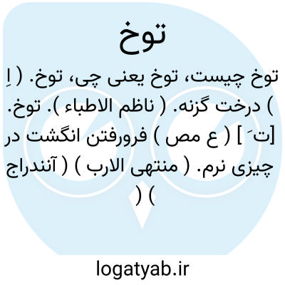 توخ. [ت َ ] ( ع مص ) فرورفتن انگشت در چیزی نرم. ( منتهی الارب ) ( آنندراج ) ( از ناظم الاطباء ) ( از اقرب الموارد ).