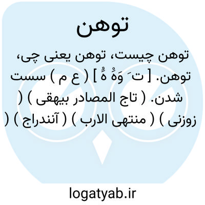 توهن. [ ت َ وَهَْ هَُ ] ( ع م ) سست شدن. ( تاج المصادر بیهقی ) ( زوزنی ) ( منتهی الارب ) ( آنندراج ) ( ناظم الاطباء ). یقال: توهن امره؛ ای ضعف. ( منتهی الارب ) ( ناظم الاطباء ). || سنگین شدن مرغ از خوردن دانه چنانکه قادر به پرواز نباشد. ( از اقرب الموارد ).