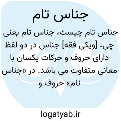 در «جناس تام» حروف و حرکات الفاظ متجانس در گفتار و نوشتار یکی، و فقط در معنا مختلفند و فرق معنایی از جمله و فحوای کلام فهمیده می شود؛