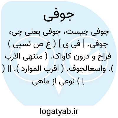جوفی. [ فی ی ] ( ع ص نسبی ) فراخ و درون کاواک. ( منتهی الارب ). واسعالجوف. ( اقرب الموارد ). || ( اِ ) نوعی از ماهی است. ( منتهی الارب ) ( مهذب الاسماء ) ( غیاث اللغات ازکشف ). جوفی و جوفیاء، نوعی ماهی است. جوالیقی گوید:گمان میکنم که هر دو معرب باشند. ( المعرب ص 113 ).