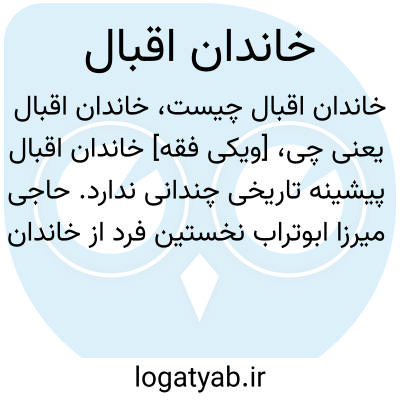 [ویکی فقه] خاندان اقبال پیشینه تاریخی چندانی ندارد. حاجی میرزا ابوتراب نخستین فرد از خاندان اقبال است که تاریخ نام و یادی از او را به حافظه سپرده است. خاندان اقبال منسوب به وی می باشد و برخی از افراد مشهور خاندان مذکور عبارتند از: میرزا ابوتراب اقبال، علی اقبال، عبدالوهاب اقبال، احمدعلی اقبال، منوچهر اقبال، خسرو اقبال، ایراندخت اقبال.