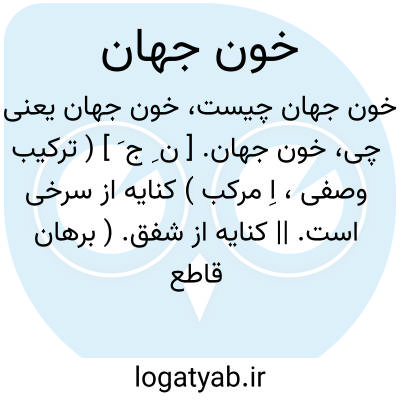 خون جهان. [ ن ِ ج َ ] ( ترکیب وصفی، اِ مرکب ) کنایه از سرخی است. || کنایه از شفق. ( برهان قاطع ) ( از آنندراج ) ( از ناظم الاطباء ). کنایه از سرخی شفق است. ( انجمن آرای ناصری ).