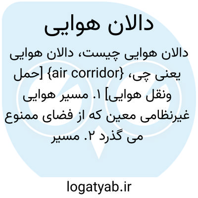 {air corridor} [حمل ونقل هوایی] 1. مسیر هوایی غیرنظامی معین که از فضای ممنوع می گذرد 2. مسیر هوایی محدود در منطقۀ عملیات نظامی که معبر امنی برای آمدوشد هواپیماهای خودی است