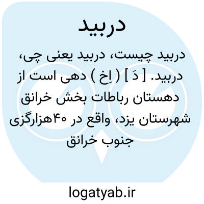 دربید. [ دَ ] ( اِخ ) دهی است از دهستان رباطات بخش خرانق شهرستان یزد، واقع در 40هزارگزی جنوب خرانق و 26هزارگزی راه خرانق به اشکذر، با 212 تن سکنه. آب آن از چشمه و راه آن مالرو است. ( از فرهنگ جغرافیایی ایران ج 10 ).