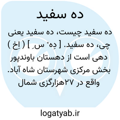 ده سفید. [ دِه ْ س ِ ] ( اِخ ) دهی است از دهستان سگوند بخش زاغه شهرستان خرم آباد. واقع در 21هزارگزی باختر زاغه. دارای 510 تن سکنه است. آب آن از سراب چشمه های آبستان تأمین می شود. راه آن اتومبیل رو است. ساکنین از طایفه سگوند بوده زمستان قشلاق می روند. ( از فرهنگ جغرافیایی ایران ج 6 ).