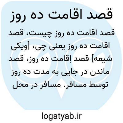[ویکی شیعه] قصد اِقامت ده روز، قصد ماندن در جایی به مدت ده روز توسط مسافر. مسافر در محل اقامت باید نمازها را کامل بخواند و روزه او صحیح است. احکام قصد ده روز در رساله های عملیه آمده است.