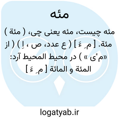 ( مئة ) مئة. [ م ِ ءَ ] ( ع عدد، ص، اِ ) ( از «م ٔی » ) در محیط المحیط آرد: المئة و المائة [ م ِ ءَ ] به افزودن الف در خط نه در لفظ، بمعنی «ده تا ده » و آن اسمی است که بدان وصف کنند... رجوع به دو ماده قبل شود.