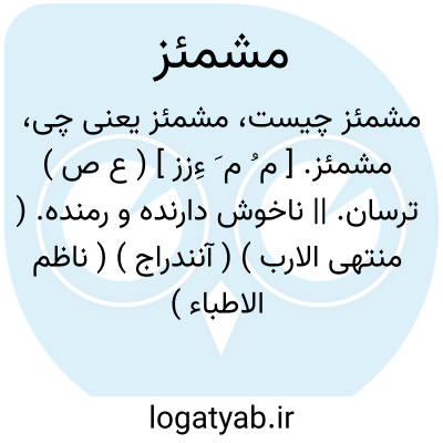 مشمئز. [ م ُ م َ ءِزز ] ( ع ص ) ترسان. || ناخوش دارنده و رمنده. ( منتهی الارب ) ( آنندراج ) ( ناظم الاطباء ) ( از اقرب الموارد ). رمیده. ناخوشدل. ( زمخشری ). کارِه. نافر. ( یادداشت مؤلف ).