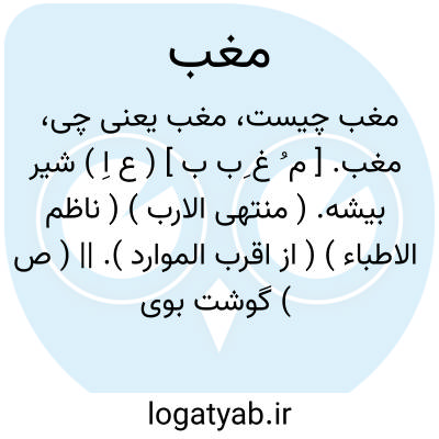 مغب. [ م ُ غ ِب ب ] ( ع اِ ) شیر بیشه. ( منتهی الارب ) ( ناظم الاطباء ) ( از اقرب الموارد ). || ( ص ) گوشت بوی گرفته. ( آنندراج ) ( ناظم الاطباء ) ( از منتهی الارب ) ( از اقرب الموارد ). || روز میان آینده قوم را. ( آنندراج ) ( از منتهی الارب ). دوستی که هر سه روز یک دفعه دوست را دیدن می کند. ( ناظم الاطباء ). || روز میان به جایی رونده. ( آنندراج ) ( از منتهی الارب ). || آنکه به چیزی دوروز نمی پردازد. ( ناظم الاطباء ).