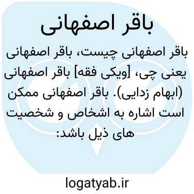 [ویکی فقه] باقر اصفهانی (ابهام زدایی). باقر اصفهانی ممکن است اشاره به اشخاص و شخصیت های ذیل باشد: • آقاباقر سعدالسلطنه اصفهانی، از رجال سیاسی و اداری عهد قاجاریه و از نیکوکاران و خیّرین اصفهان• استاد باقر اصفهانی، از معماران چیره دست عصر زندیه در اصفهان• باقر کیانی فلاورجانی اصفهانی، فاضل ارجمند و ادیب فرزانه در اصفهان• باقر حمیدی اصفهانی، شاعر ادیب و عارف اصفهانی• باقر بن محمدکاظم اصفهانی، از خطاطان و نویسندگان کتب در اصفهان• باقر بن محمدکاظم الماسی اصفهانی، از خوشنویسان قرن سیزدهم هجری در اصفهان• آقا باقر خوراسکانی اصفهانی، معروف به «باقرخان» یکی از حاکمان اصفهان• باقر بن محمدعلی جابری اصفهانی، از اعیان و اشراف اصفهان و دارای موقوفات متعدد در اصفهان• باقرخان بن محمد عراقی اصفهانی، از چهره های آزادی خواه و مبارز عصر مشروطیت و پس از آن• باقر خاص بن مرتضی آشوری اصفهانی، شاعر ادیب قرن سیزده و چهارده هجری در اصفهان• سیدباقر بن هاشم رشتیان اصفهانی، هنرمند نقّاش در اصفهان• باقر برهمن اصفهانی، شاعر ادیب قرن چهاردهم هجری در اصفهان• باقر بنا اصفهانی، از خوشنویسان گمنام عهد صفویه در اصفهان• میرزاباقر تبریزی اصفهانی، معروف به «ایبک» شاعر ادیب فاضل در اصفهان• باقر سخائی اصفهانی، از شعرای اصفهان• باقر قاضی زاده تبریزی اصفهانی، معروف به «قاضی زاده عباس آباد» عالم فاضل و ادیب شاعر، از دانشوران اواخر عهد صفویه در اصفهان• آقاباقر نقاش اصفهانی، محمدباقر اصفهانی معروف به «آقا باقر نقاش»، از نقاشان و قلمدان سازان هنرمند عصر زندیه و قاجاریه در اصفهان