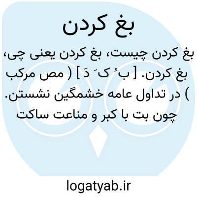 بغ کردن. [ ب ُ ک َ دَ ] ( مص مرکب ) در تداول عامه خشمگین نشستن. چون بت با کبر و مناعت ساکت نشستن. عبوس بودن. ترشروی بودن. درهم کشیدن چهره.