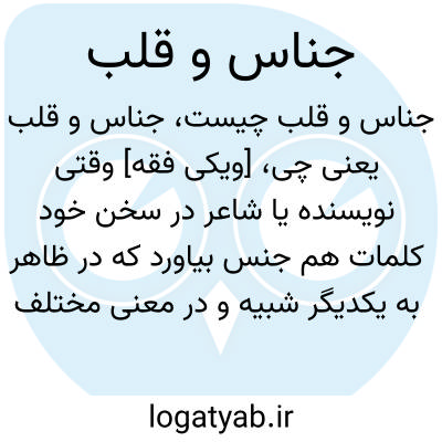 [ویکی فقه] وقتی نویسنده یا شاعر در سخن خود کلمات هم جنس بیاورد که در ظاهر به یکدیگر شبیه و در معنی مختلف باشند، از صنعت جناس استفاده کرده است.