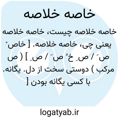 خاصه خلاصه. [ خاص ْ ص َ / ص ِ خ ُ ص َ / ص ِ ] ( ص مرکب ) دوستی سخت از دل. یگانه. با کسی یگانه بودن [ در تداول عامیانه ]: فلانی دوست خاصه خلاصه او بود، یعنی فلانی دوست بسیار نزدیک او بود.