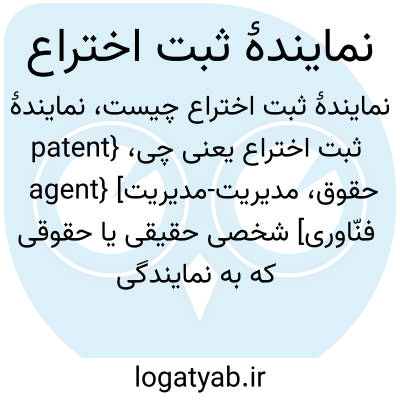 {patent agent} [حقوق، مدیریت-مدیریت فنّاوری] شخصی حقیقی یا حقوقی که به نمایندگی از طرف مخترع تقاضانامۀ ثبت اختراع را تهیه و پیگیری می کند، اما وکیل مخترع در دعاوی حقوقی نیست