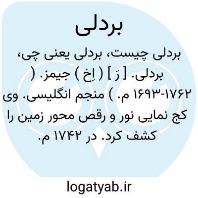 بردلی. [ رَ ] ( اِخ ) جیمز. ( 1693-1762 م. ) منجم انگلیسی. وی کج نمایی نور و رقص محور زمین را کشف کرد. در 1742 م. مدیر رسدخانه سلطنتی بود. ( دایرة المعارف فارسی ).